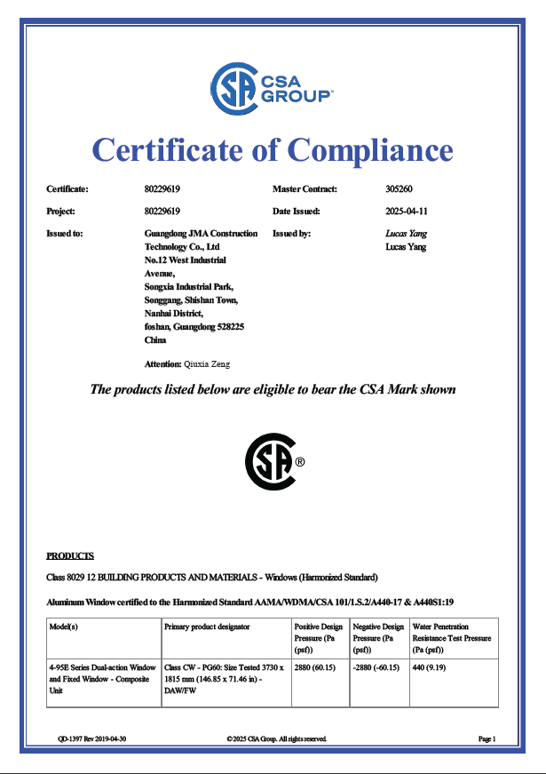 北美市場(chǎng):產(chǎn)品通過(guò)加拿大 CSA 認(rèn)證,表明產(chǎn)品性能通過(guò)北美現(xiàn)行標(biāo)準(zhǔn)要求,更標(biāo)志著堅(jiān)美系統(tǒng)門窗成為少數(shù)同時(shí)滿足北美準(zhǔn)入要求與中國(guó)建筑需求的系統(tǒng)門窗品牌。